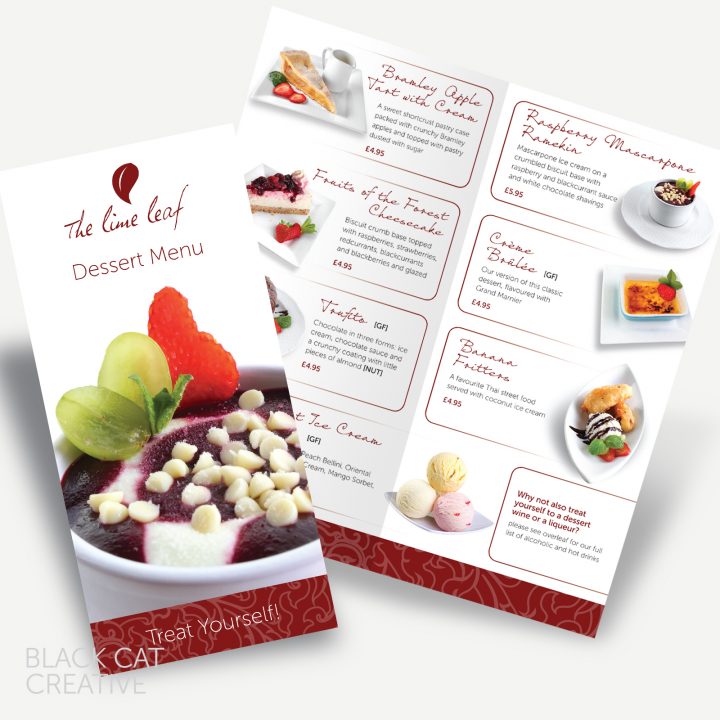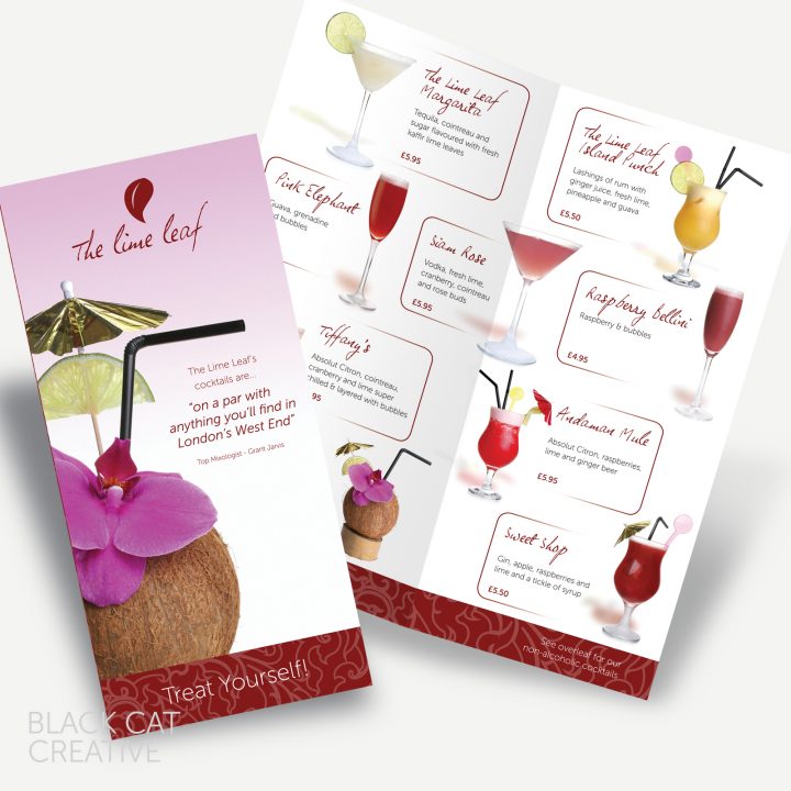 The Lime Leaf Restaurant asked Black Cat Creative to design some tempting new menus for their Desserts and Cocktails which would reflect the colours, tastes and atmosphere of the Lime Leaf.